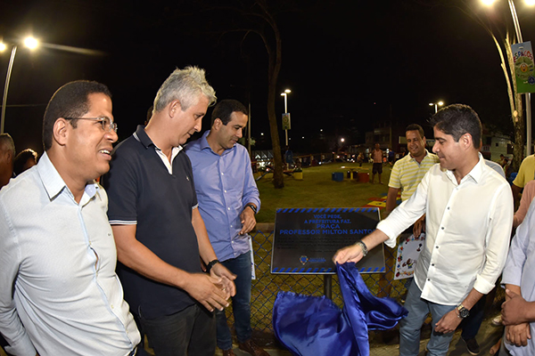 Os moradores de Valéria foram beneficiados com duas ações da Prefeitura nesta sexta-feira (18). Uma delas foi a entrega da Praça Milton Santos completamente requalificada, com cerimônia que contou com a presença do prefeito ACM Neto. Em seguida, o gestor assinou a ordem de serviço para início da modernização da iluminação na localidade, dentro do programa Iluminando Nosso Bairro. Também estiveram presentes nos eventos o vice-prefeito e secretário de Infraestrutura e Obras Públicas (Seinfra), Bruno Reis, gestores municipais e população.