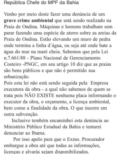 Candidata a vereadora pelo NOVO, Vastiane Evelise apresentou provas e documentos que enquadram o avanço de um muro na praia de Ondina. Conforme cita o documento (abaixo), trata-se de “um grave crime ambiental na praia de Ondina”.