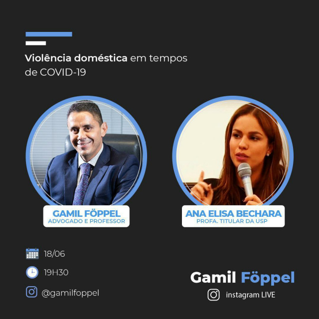 O aumento dos casos de violência contra mulheres nos lares brasileiros durante a pandemia de Covid-19 será um dos temas da conversa entre o advogado e professor de Direito, Gamil Föppel, e a professora titular de Direito Penal da Universidade de São Paulo (USP), Ana Elisa Bechara. A live “Violência doméstica em tempos de Covid-19” ocorrerá às 19h30 desta quinta-feira (18) e será transmitida na página do Instagram de Gamil (@gamilfoppel). Em estados como São Paulo e Rio de Janeiro, os casos de violência doméstica aumentaram 42% e 50%, respectivamente, durante a pandemia, como apontou Ana Elisa Bechara.